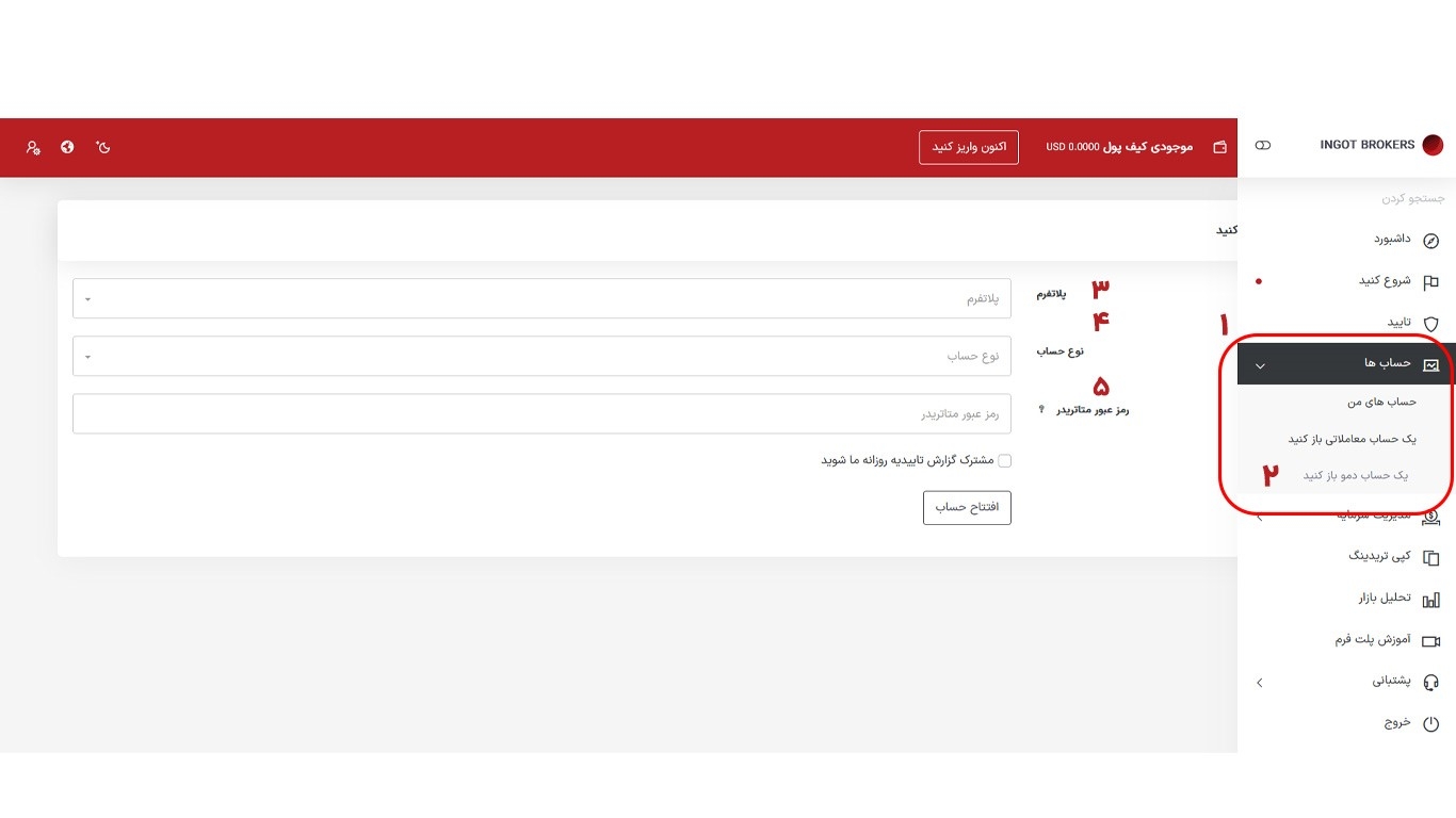 در بروکر اینگات برای این کار باید ابتدا وارد پنل کاربریتان شوید، همانطور که در تصویر میبینید در حرکت اول (1) از منوی سمت راست روی گزینه حسابها کلیک کنید، سپس روی "یک حساب دمو باز کنید" (2) کلیک نماید تا صفحه وسط تصویر باز شود. در قسمت پلتفرم (3)، پلتفرم معاملاتی خود را از بین متاتریدر 4 و 5 انتخاب کنید، سپس در بخش نوع حساب (4) یکی از سه مدل حساب بروکر اینگات که بالاتر شرح داده شد را وارد کرده و در آخر (5) نیز یک رمز عبور برای حسابتان تعریف کرده و روی گزینه افتتاح حساب کلیک کنید تا یک حساب معاملاتی دمو برای شما ایجاد شود، سپس با یوزرنیم و پسورد و آدرس سروری که به شما داده میشود میتوانید وارد متاتریدر شوید و حساب را تست کنید.