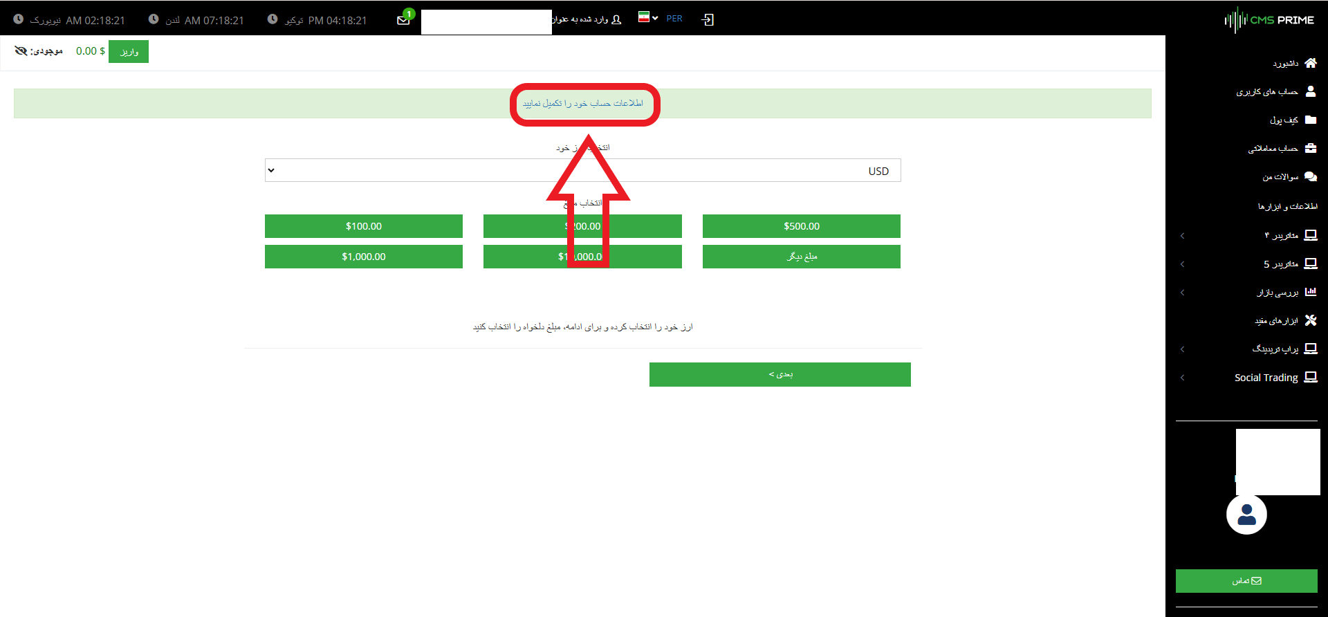جهت واریز به بروکر CMS Prime از منوی کنار صفحه بر روی "امور مالی" و سپس بر روی "شارژ حساب" کلیک کنید.