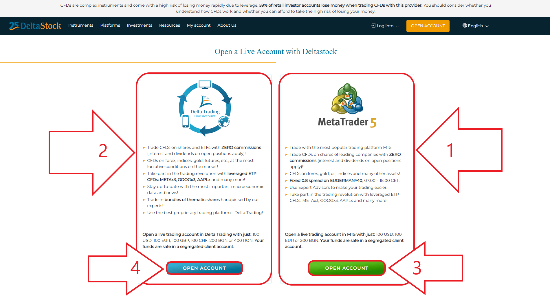 جهت ثبت نام در بروکر دلتا استوک ابتدا از اینجا وارد سایت این بروکر شوید، بر روی "Open Account" و سپس "Open Live Account" کلیک کنید.