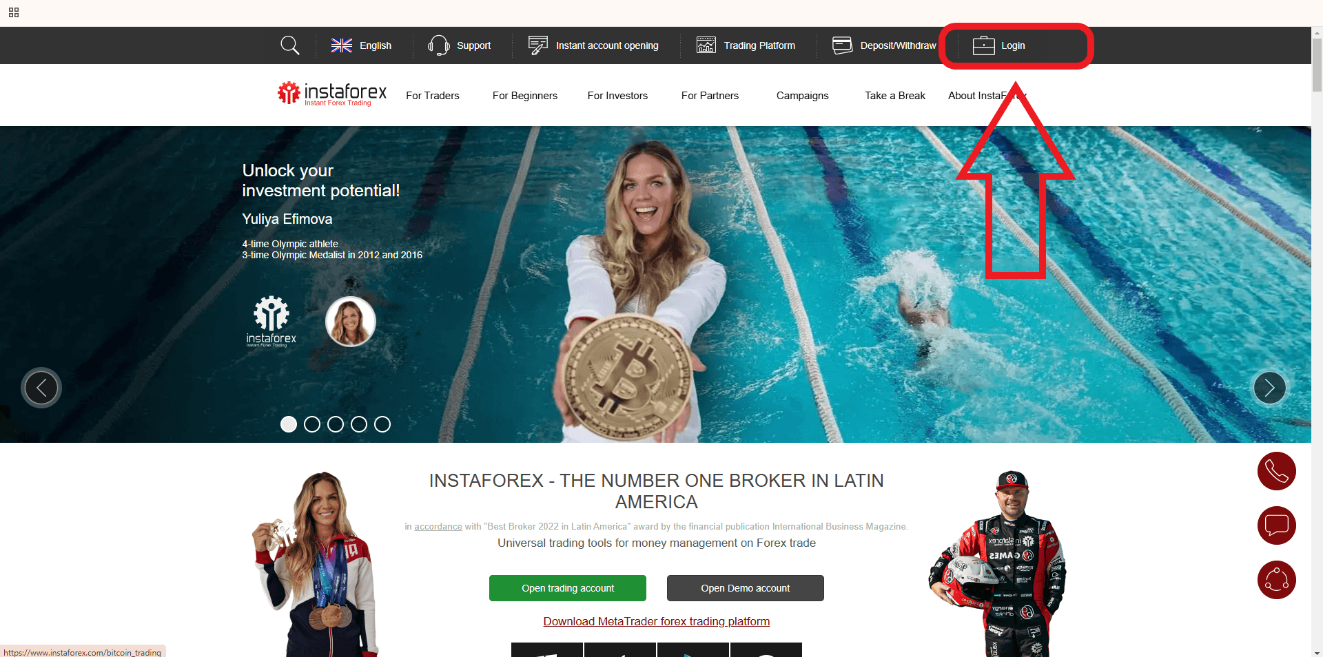 جهت ثبت نام در بروکر اینستا فارکس ابتدا وارد سایت www.instaforex.com شوید، سپس بر روی گزینه Login در بالای صفحه کلیک کنید.