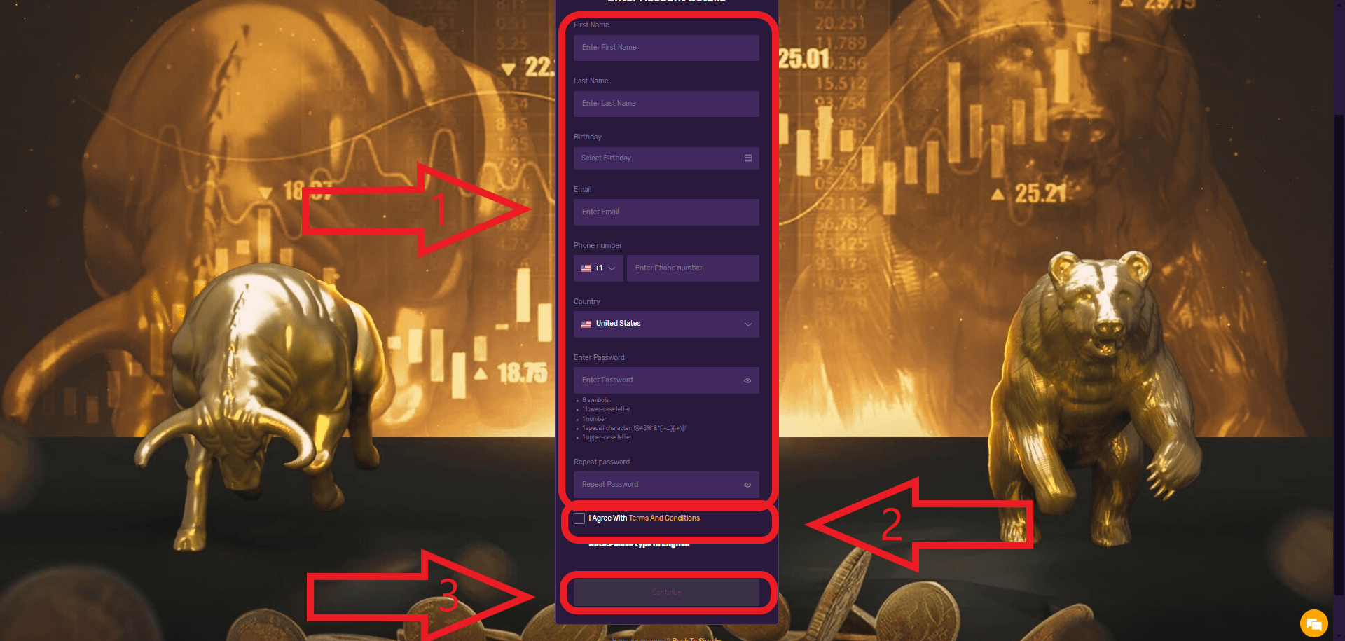 در ادامه باید ابتدا اطلاعات شخصی و هویتی خود مانند: نام، آدرس ایمیل، شماره موبایل و کشور خود را وارد کنید. سپس تیک تایید قوانین را بزنید و بر روی دکمه Continue کلیک کنید.