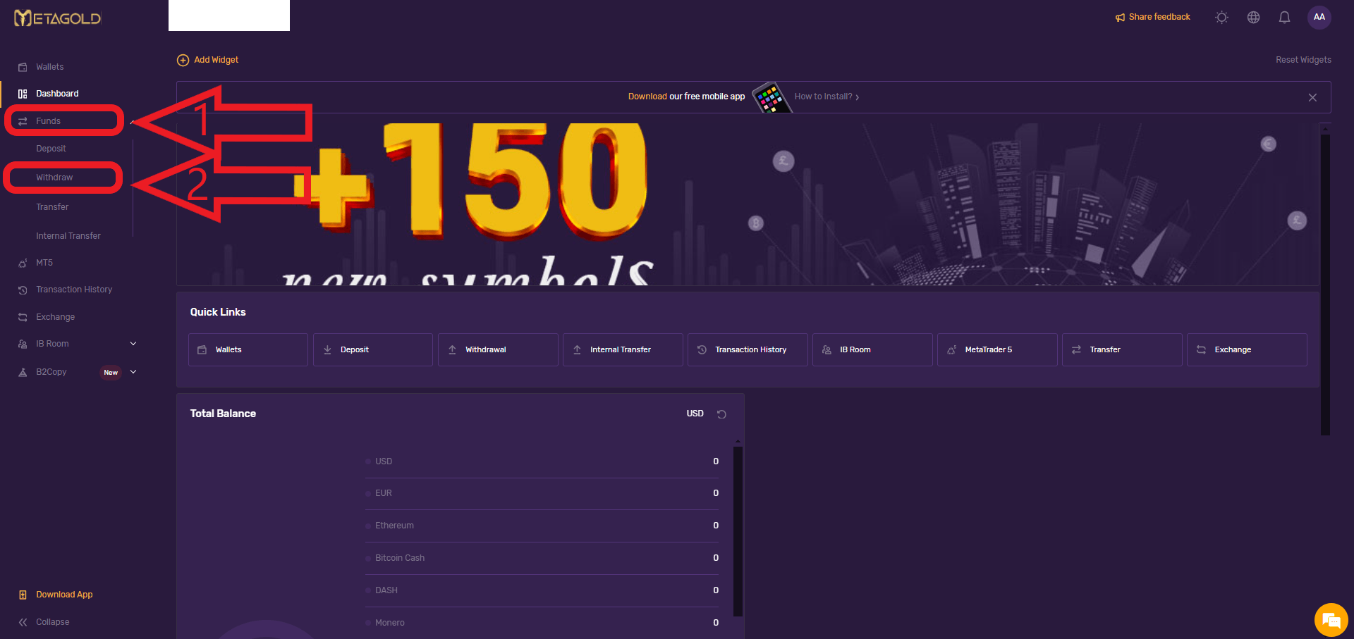 جهت برداشت از بروکر متا گلد ابتدا از منوی کنار صفحه بر روی گزینه Funds کلیک کنید، سپس Withdraw را انتخاب کنید.