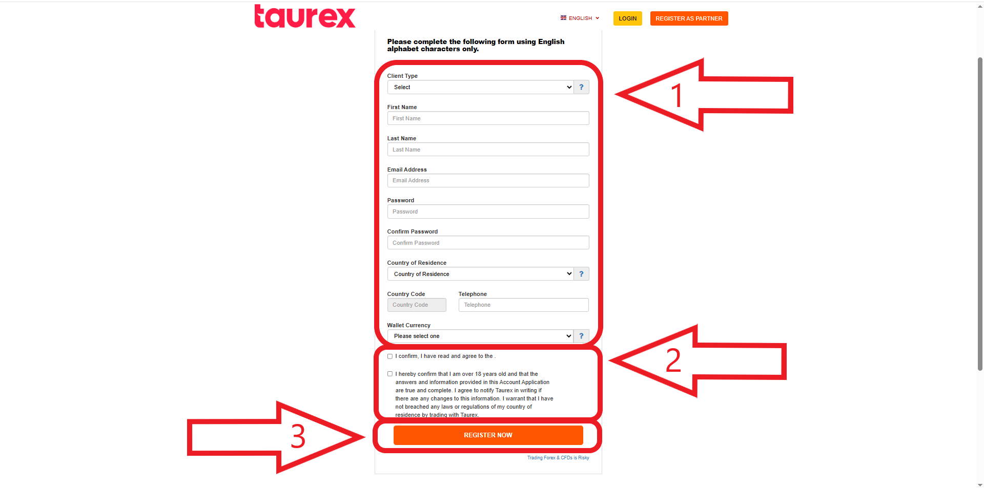 جهت ثبت نام در بروکر تائورکس ابتدا از اینجا وارد سایت شوید و سپس بر روی "Open Account" کلیک کنید.