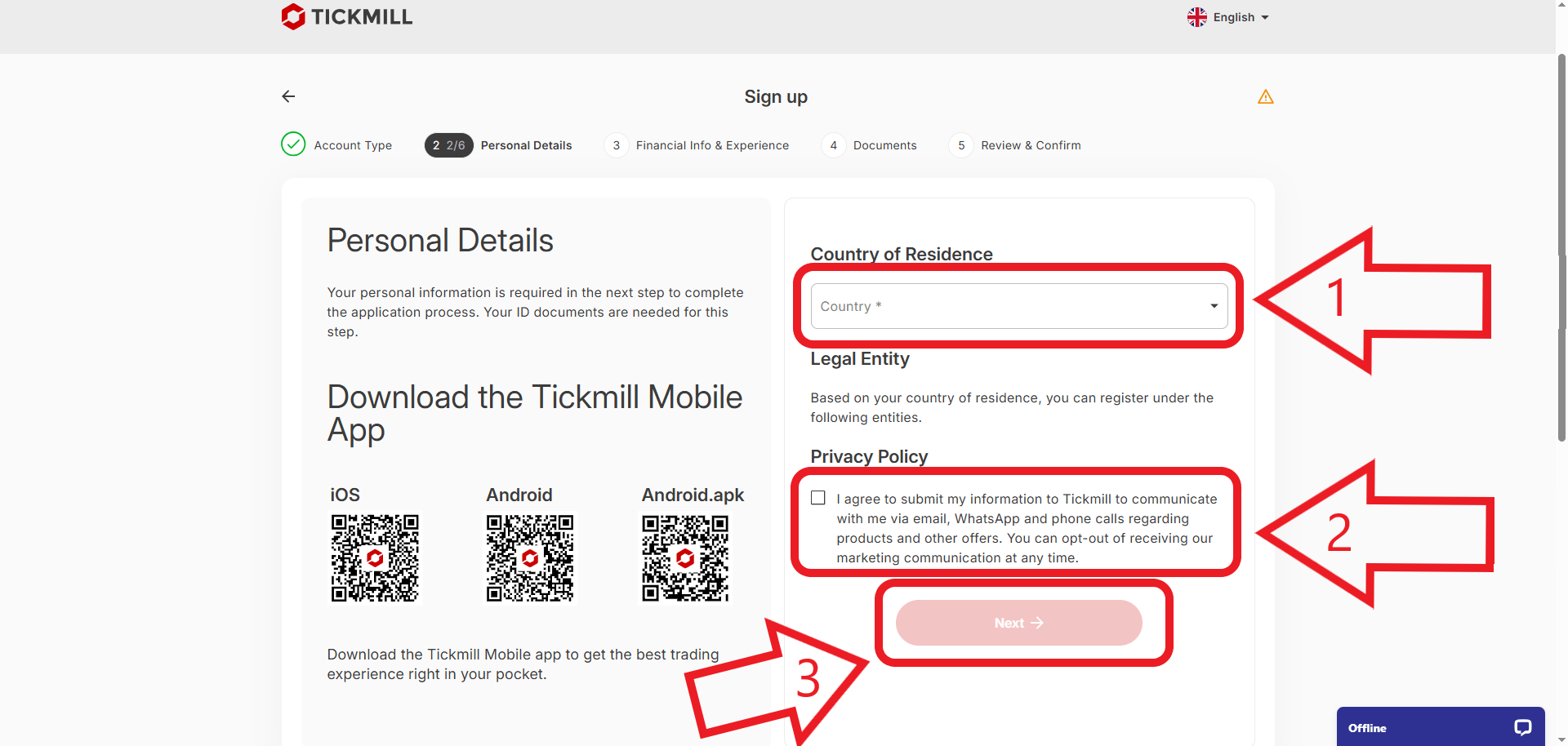 جهت ثبت نام در بروکر تیک میل ابتدا وارد سایت tickmill.com شوید و بر روی "Create Account" کلیک کنید.