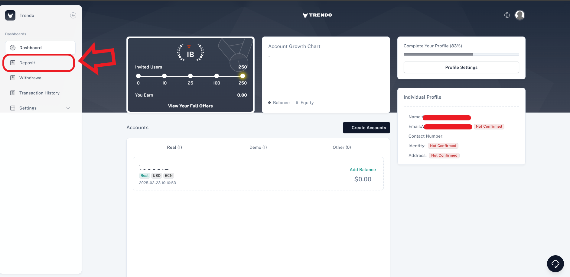 جهت واریز به بروکر ترندو ابتدا وارد صفحه حساب کاربری خود شوید سپس از منو کنار صفحه بر روی گزینه Deposit کلیک کنید.
