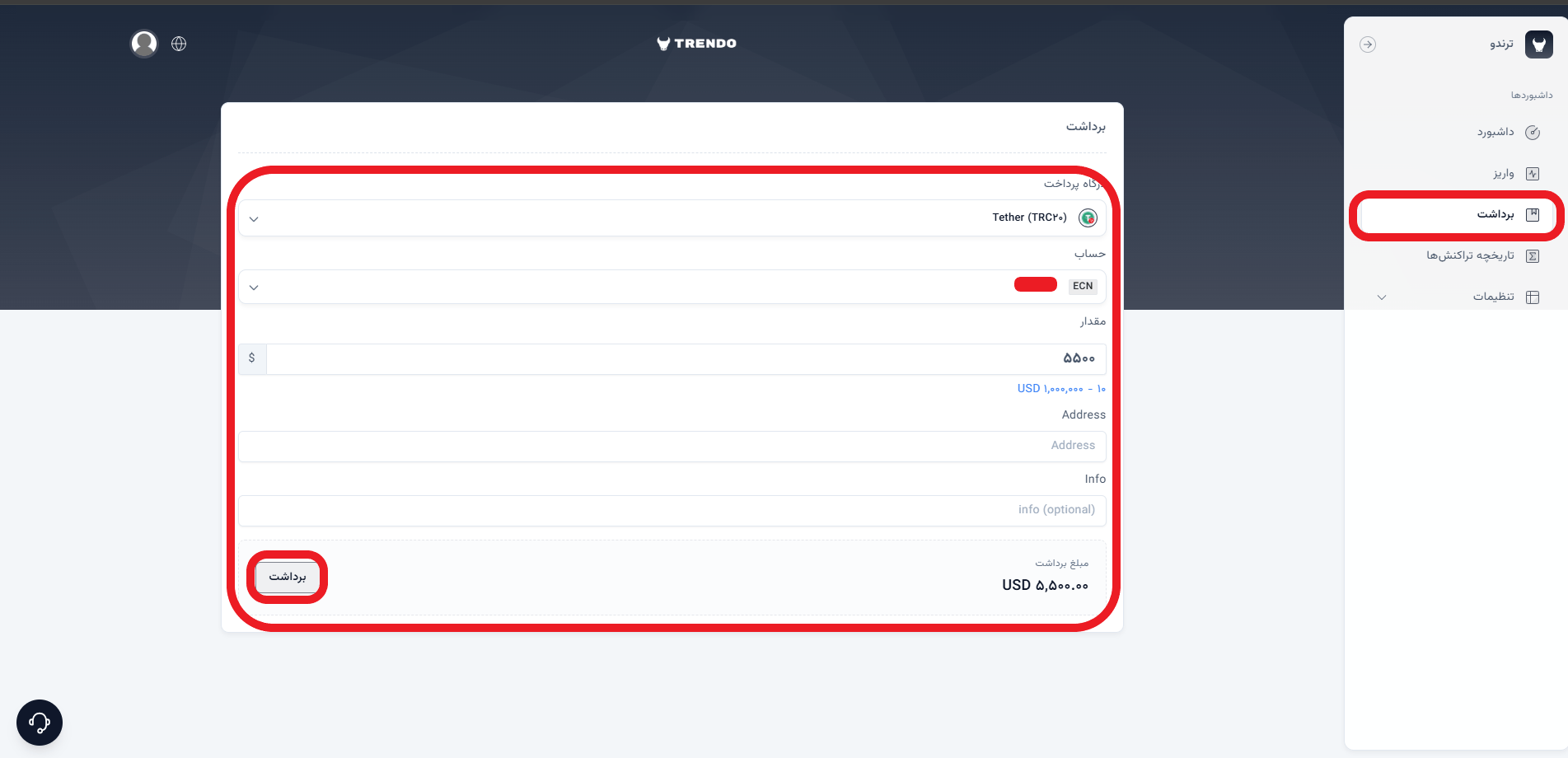 نکته: در بخش برداشت میتوانید از طریق تاپ چنج و برداشت ریال که مستقیم به حساب بانکی واریز میشود برداشت خود را به ریال انجام دهید.