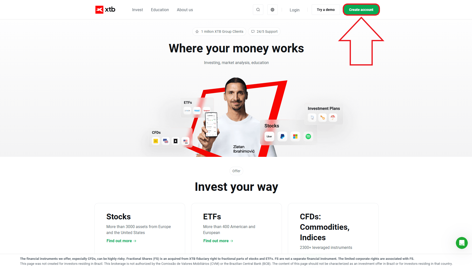 جهت ثبت نام در بروکر XTB از اینجا وارد سایت شوید و بر روی "Create Account" کلیک کنید.