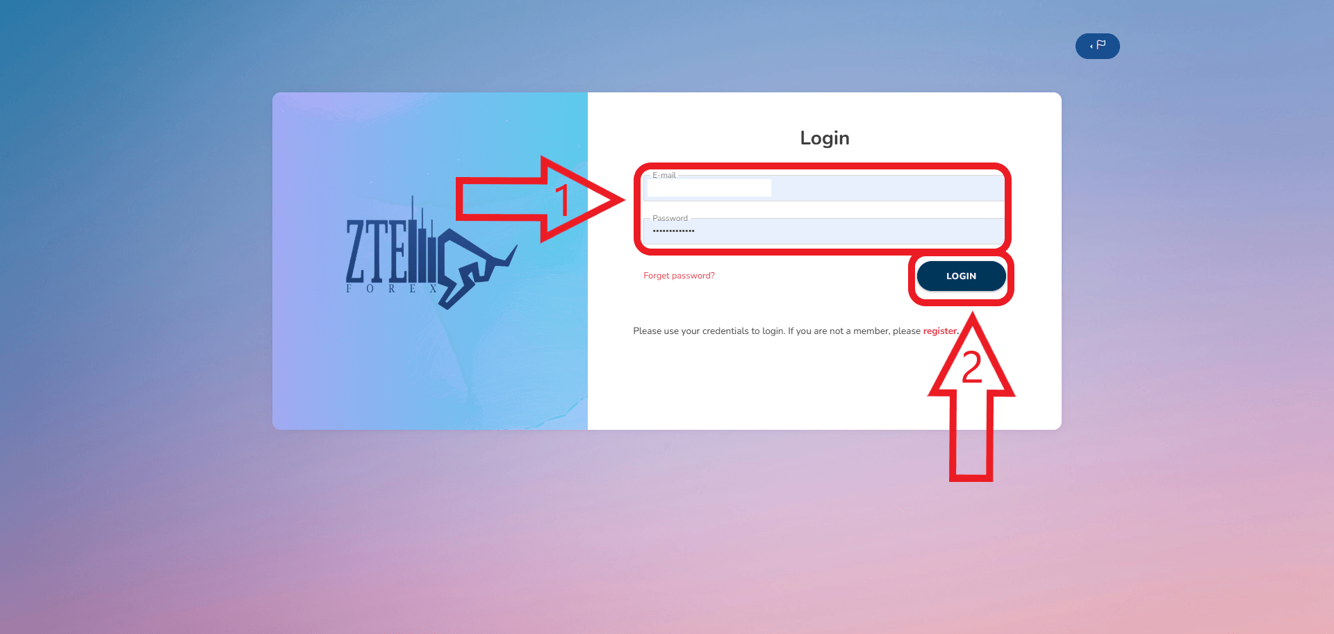 جهت ثبت نام در بروکر زد تی ای از اینجا وارد سایت شوید و بر روی "ورود" کلیک کنید.